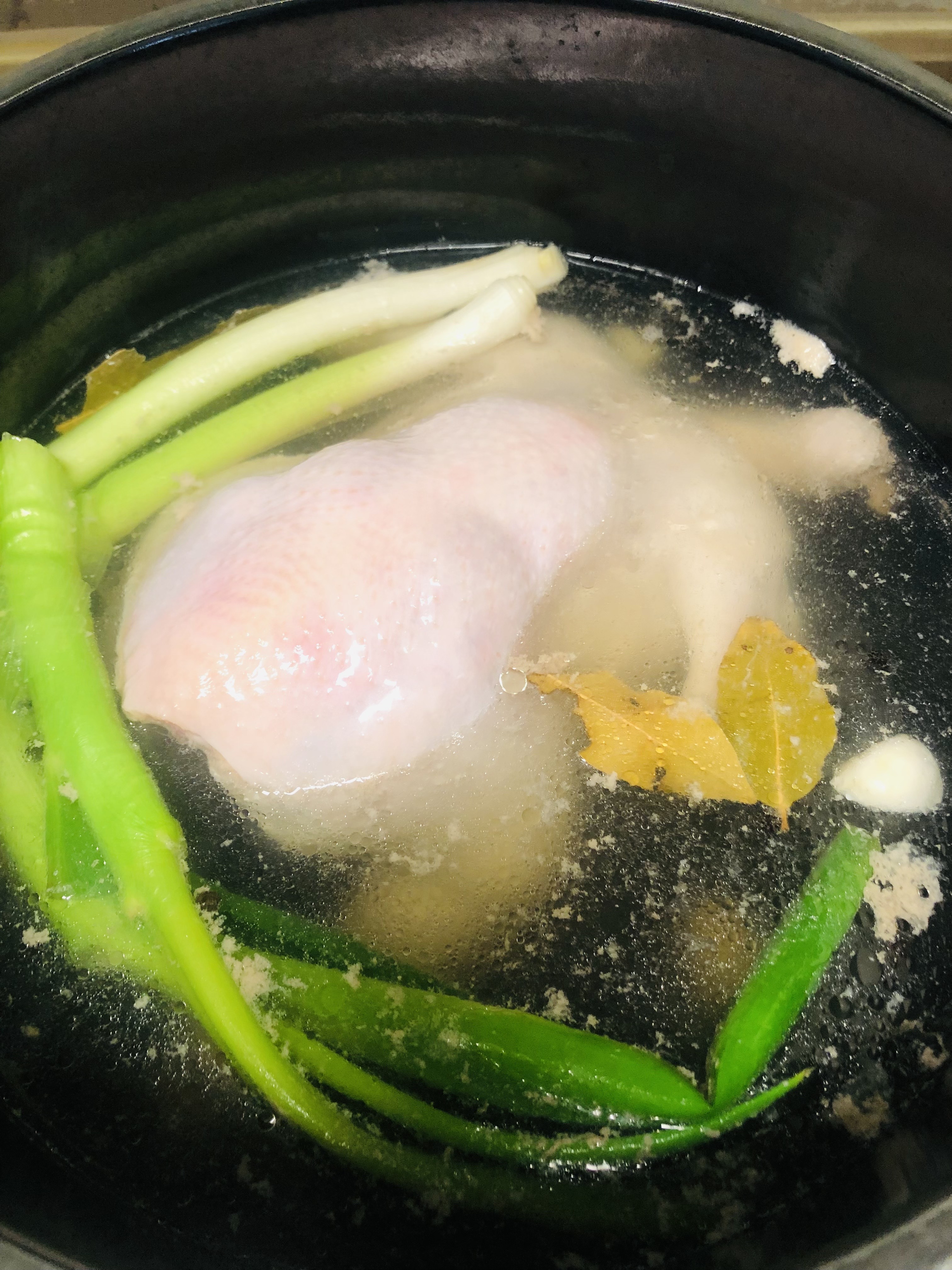 1. 큰 냄비에 물 3L를 넣고 손질한 닭을 넣고 대파 1개, 마늘 5개, 후추 10개, 월계수 잎 3장을 넣고 30분간 삶아 주세요.