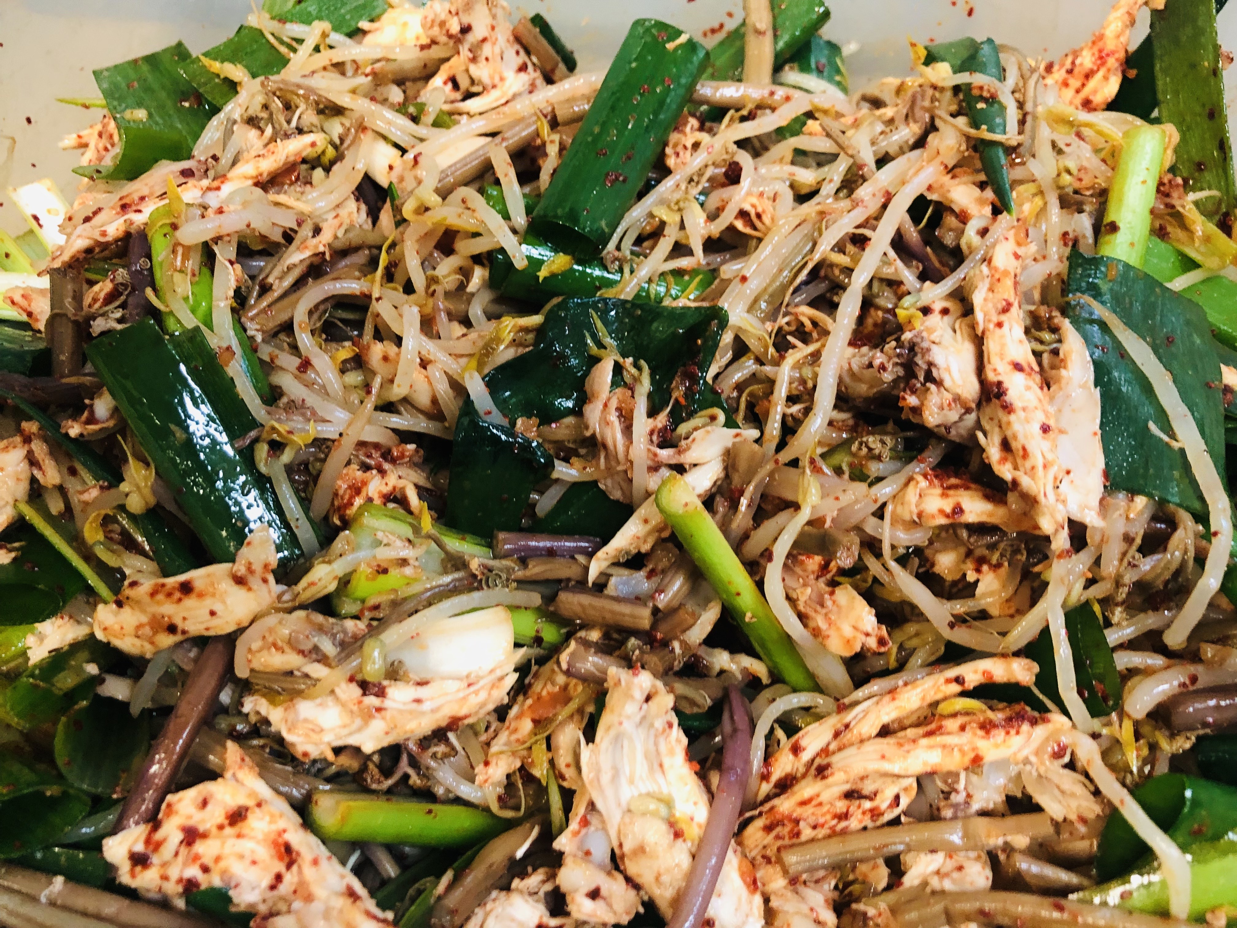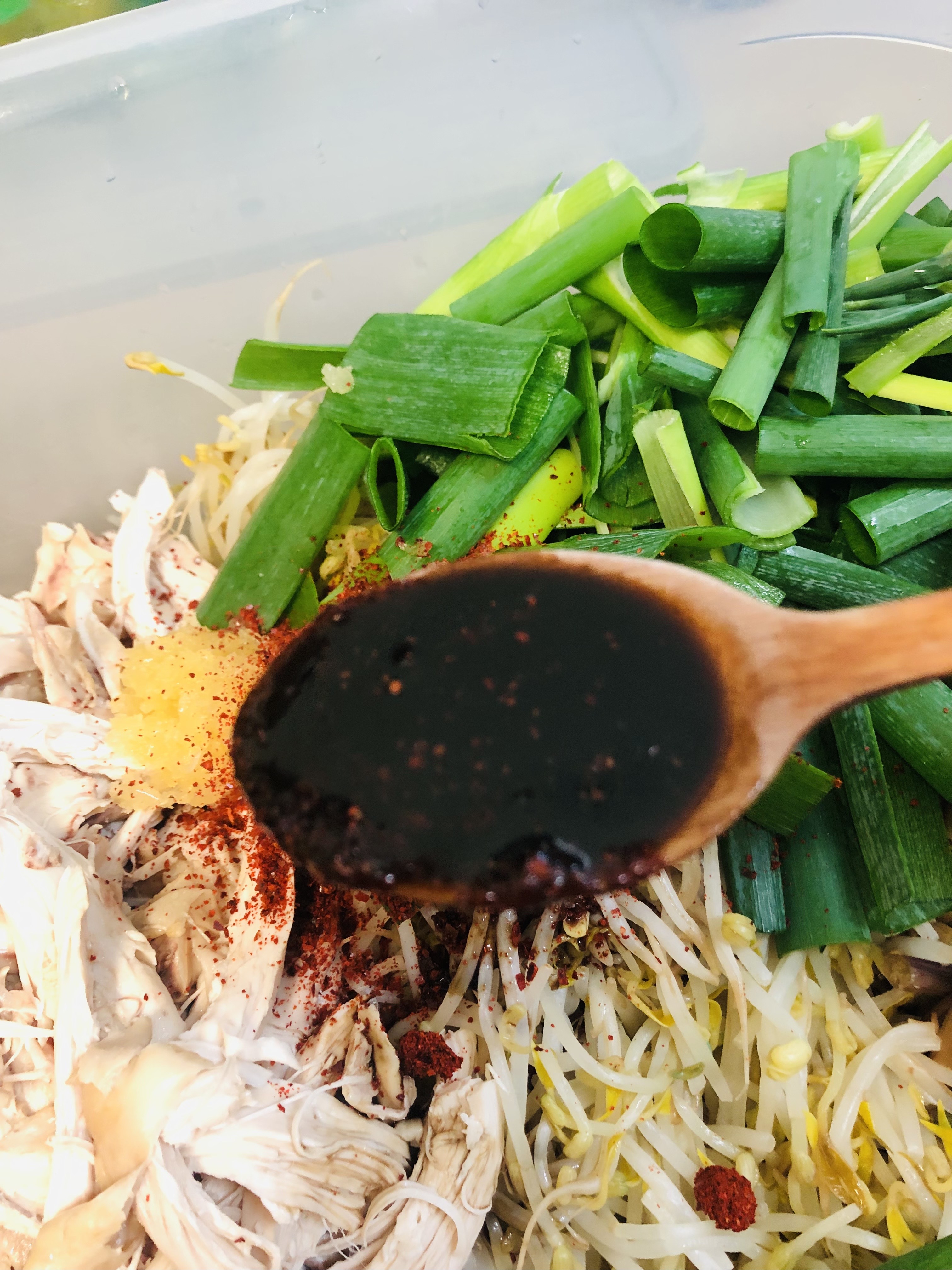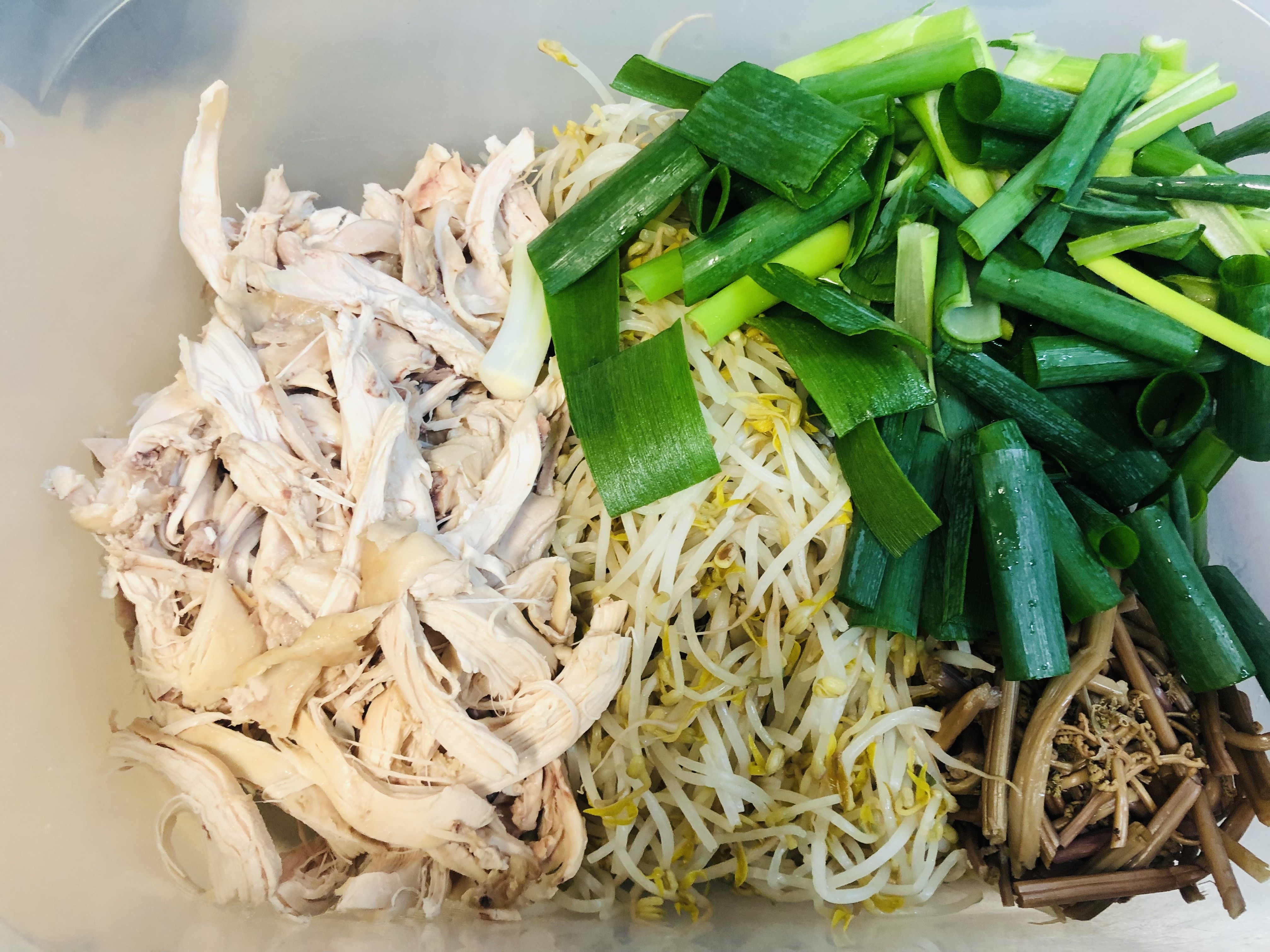 5. 큰 볼에 뼈를 바른 닭고기, 데친 숙주, 고사리, 대파를 넣어 주세요.