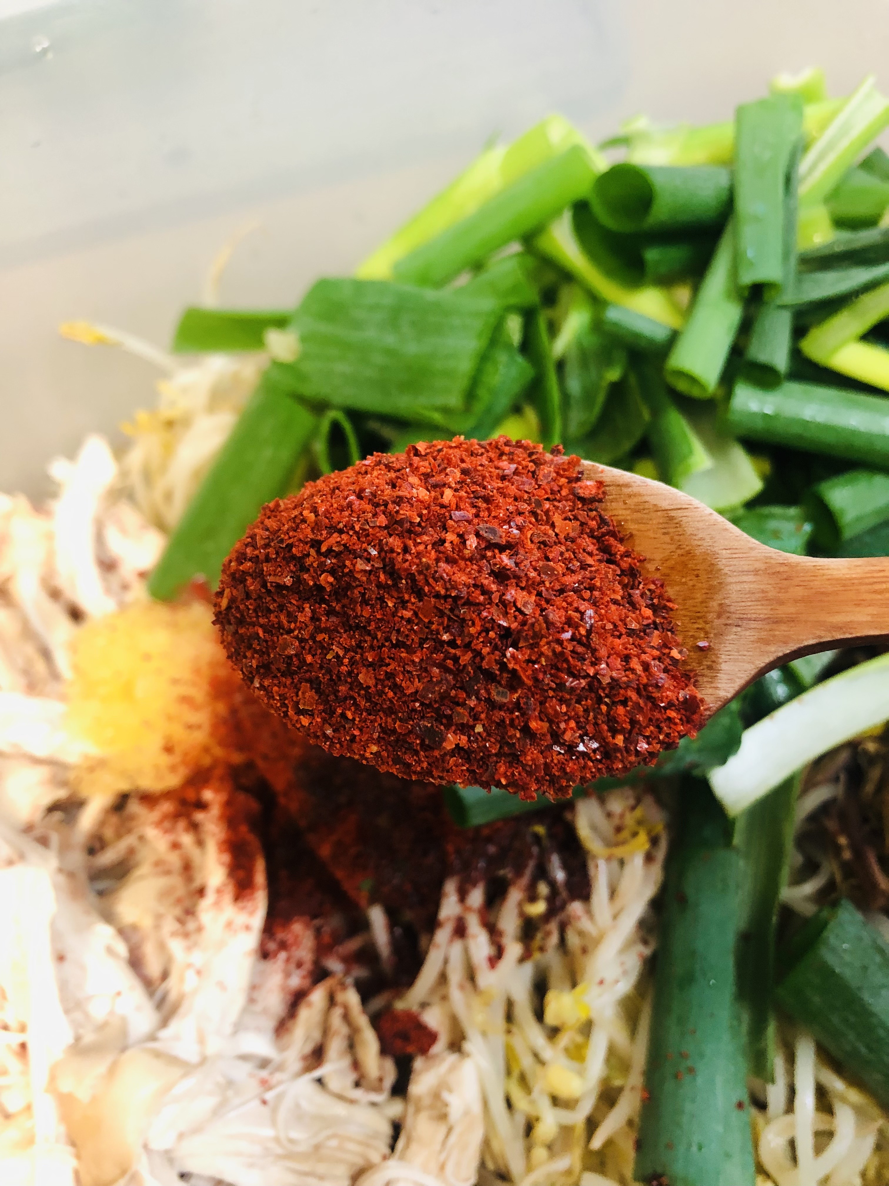 6. 마늘 1 수저->고춧가루 4 수저-> 국간장 4 수저-> 들기름 1 수저를 넣어 주세요.