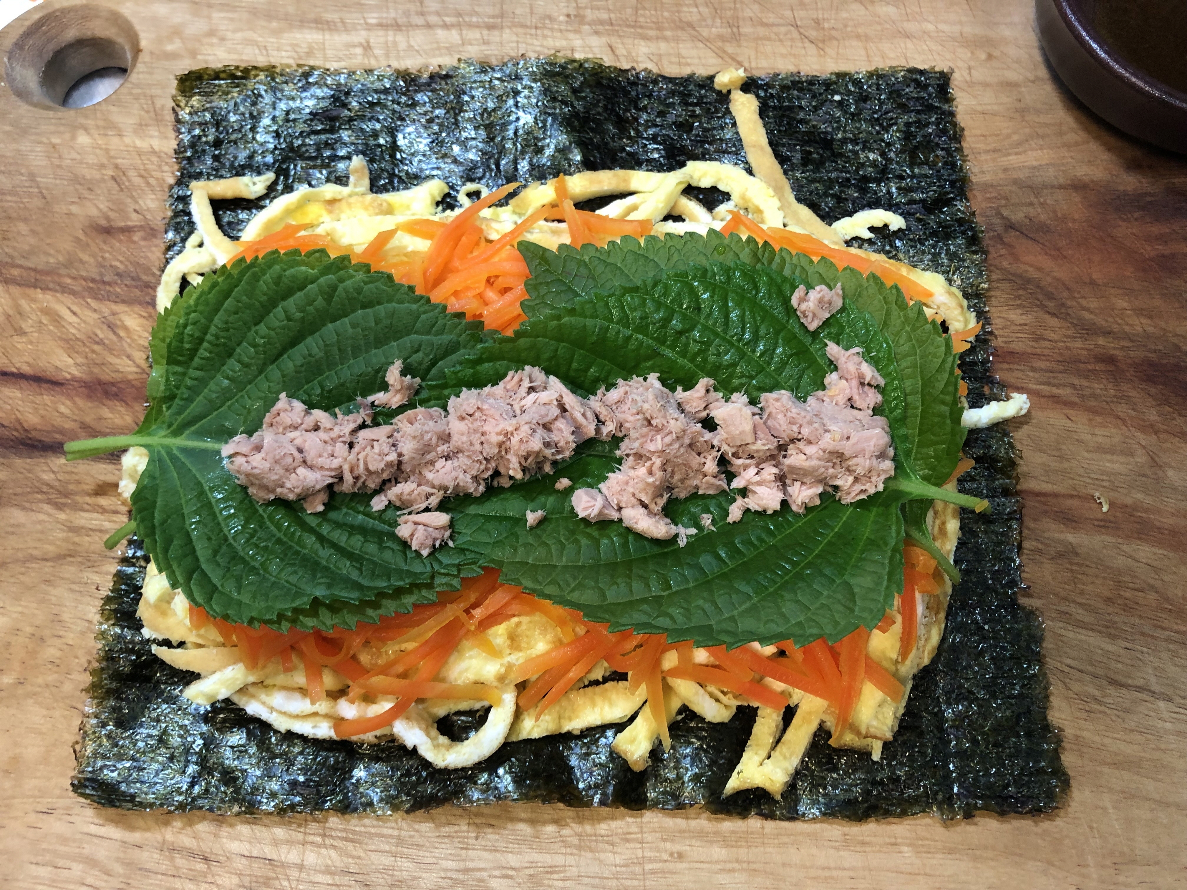 김밥용 김에 달걀지단을 펼쳐주고 당근채 볶음 깔아주고 깻잎 깔고 참치 올리고