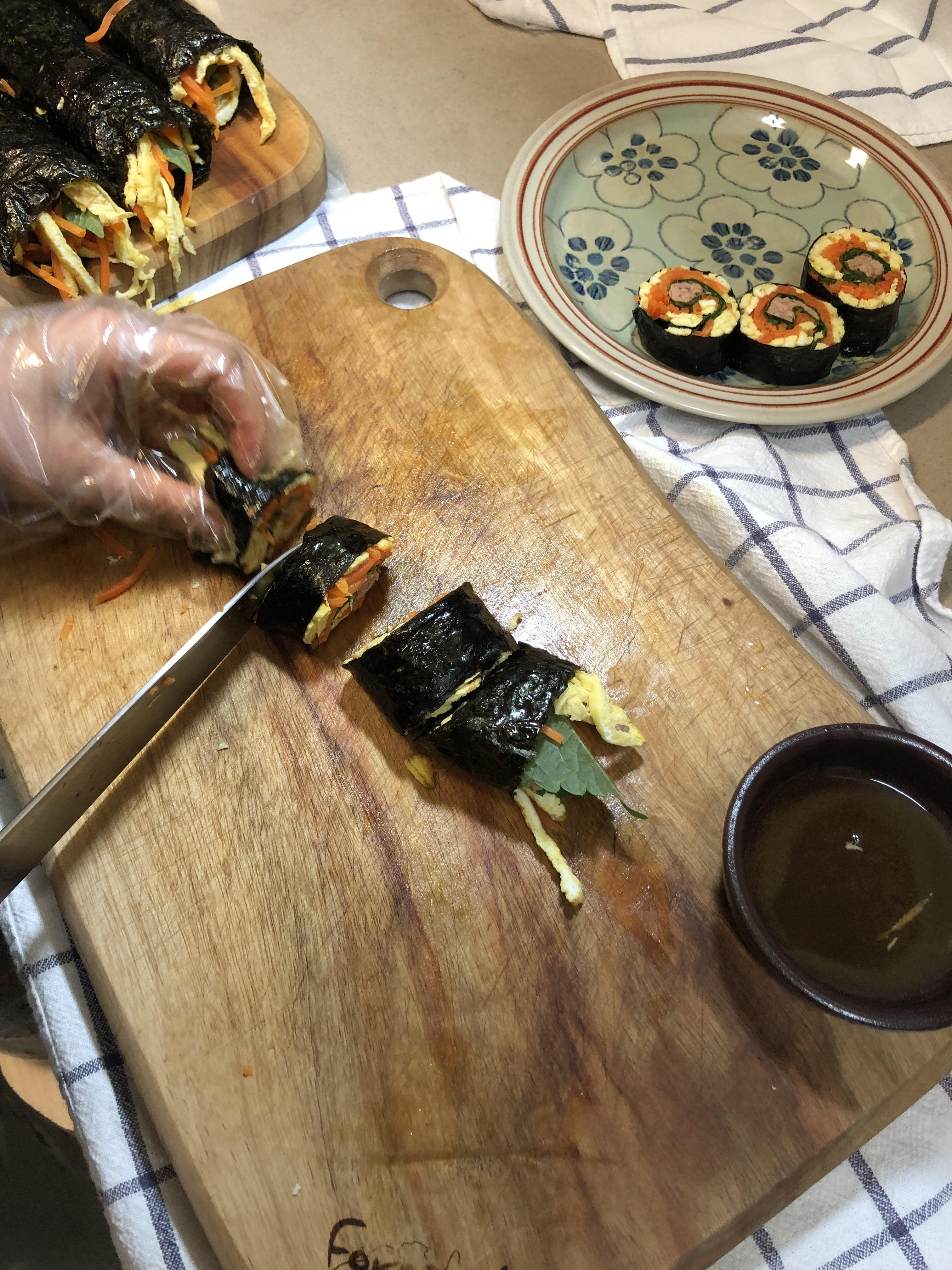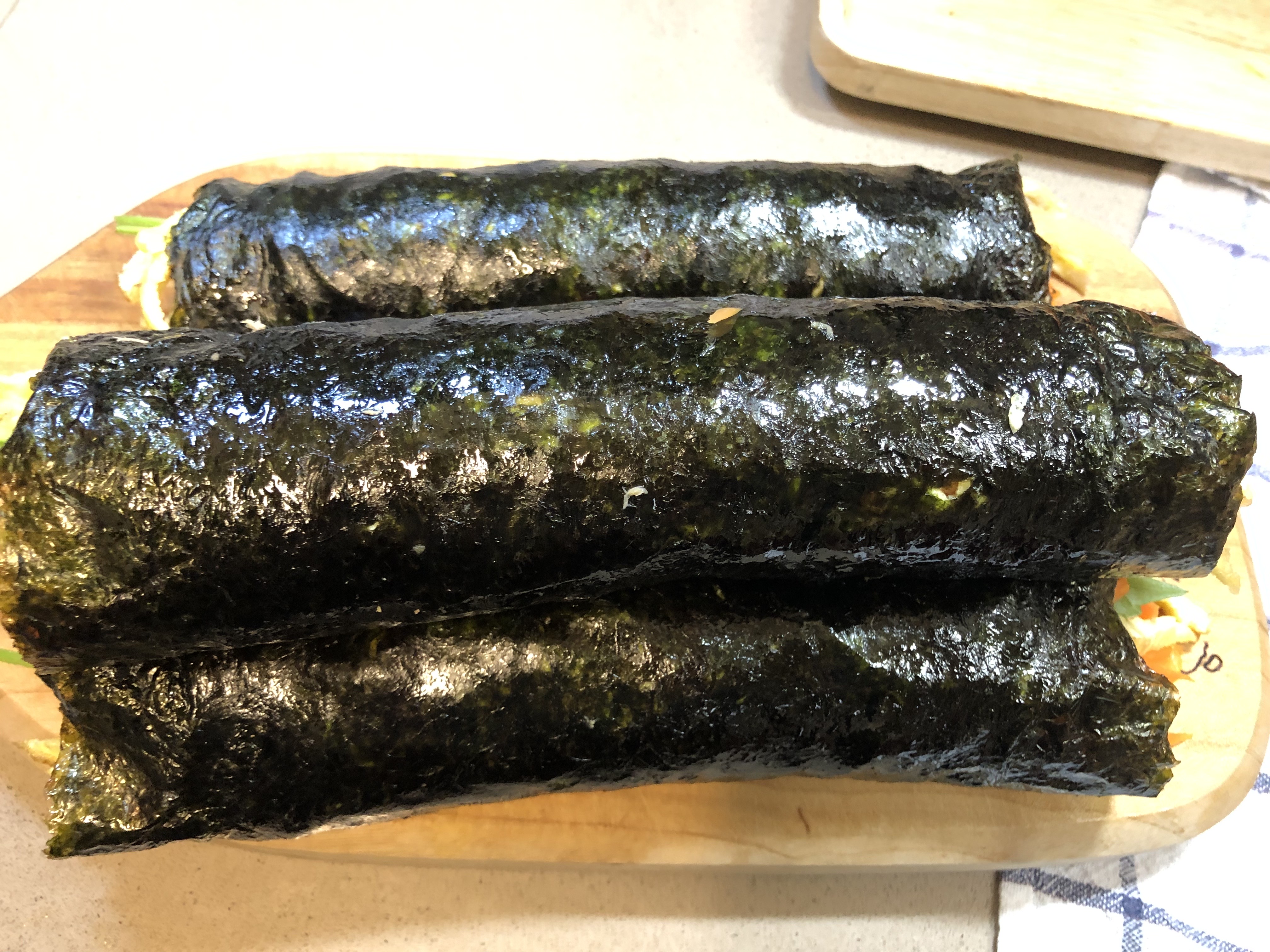 돌돌 잘 말아주고 전 김 끝에 들기름을 발라 고정시켜 주었어요~