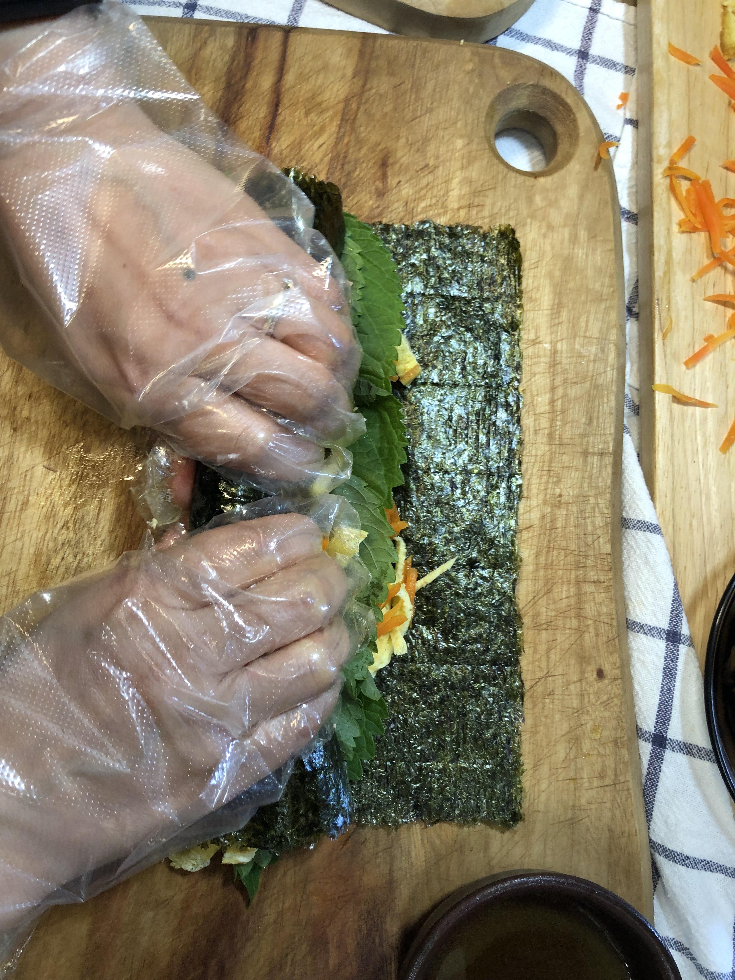 돌돌 잘 말아주고 전 김 끝에 들기름을 발라 고정시켜 주었어요~