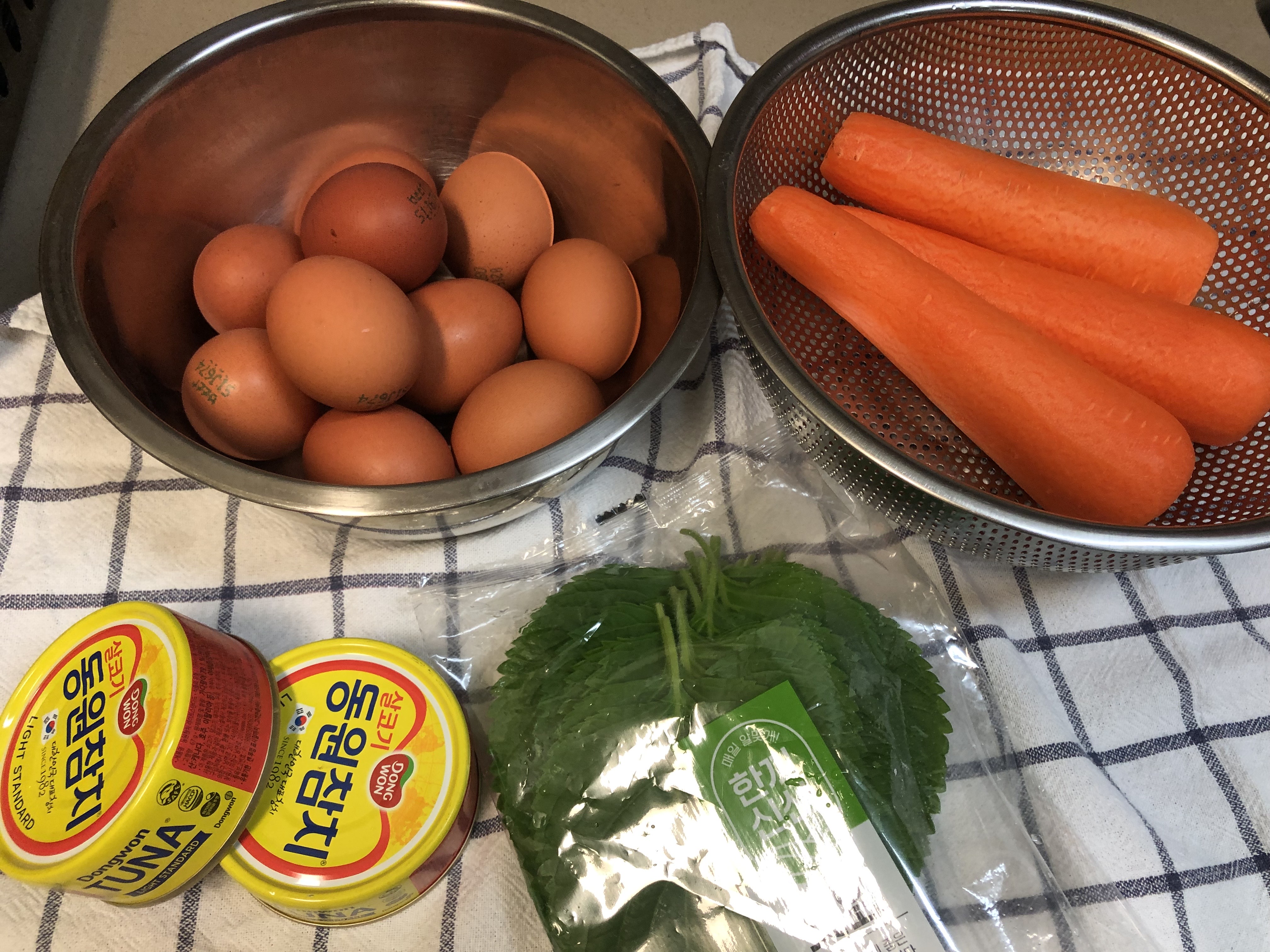 재료준비: 달걀 10개 , 당근 3개 , 참치캔 작은 거 2개, 깻잎 한 봉지, 소금 약간 , 올리브유