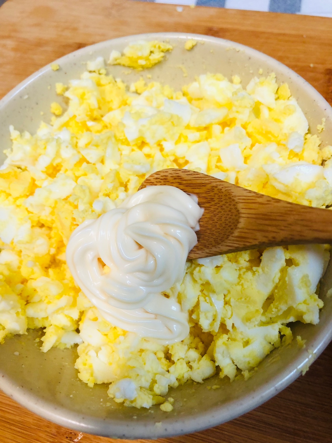 3. 삶은 달걀을 포크로 으깨 주세요~ 식감 있게