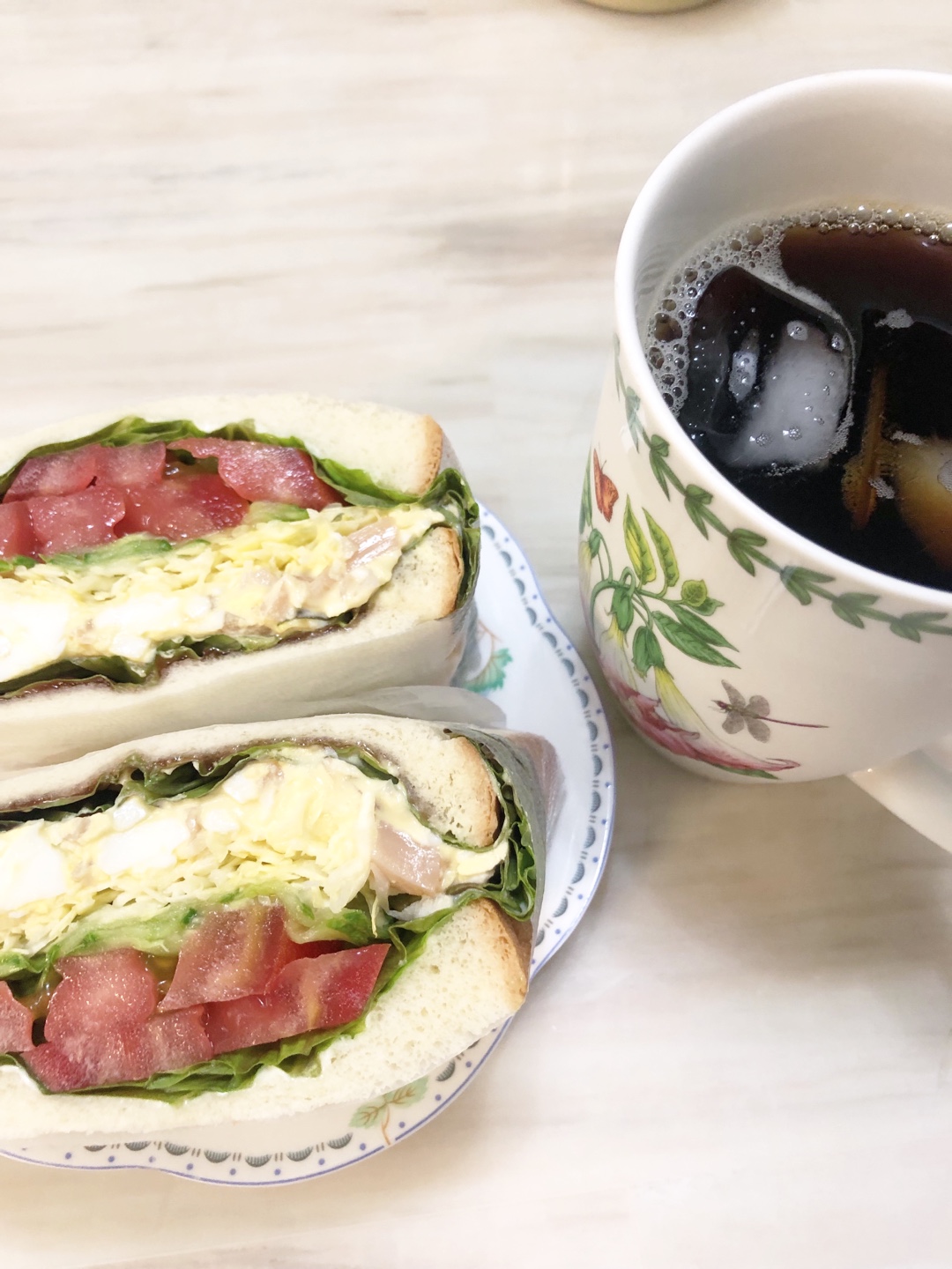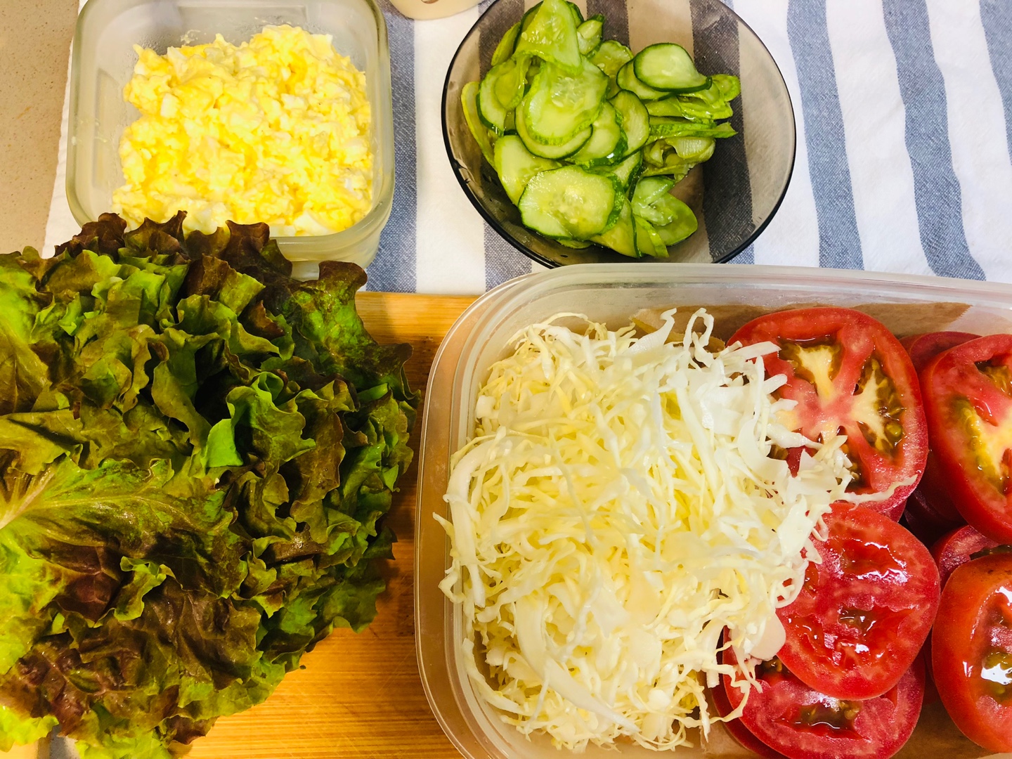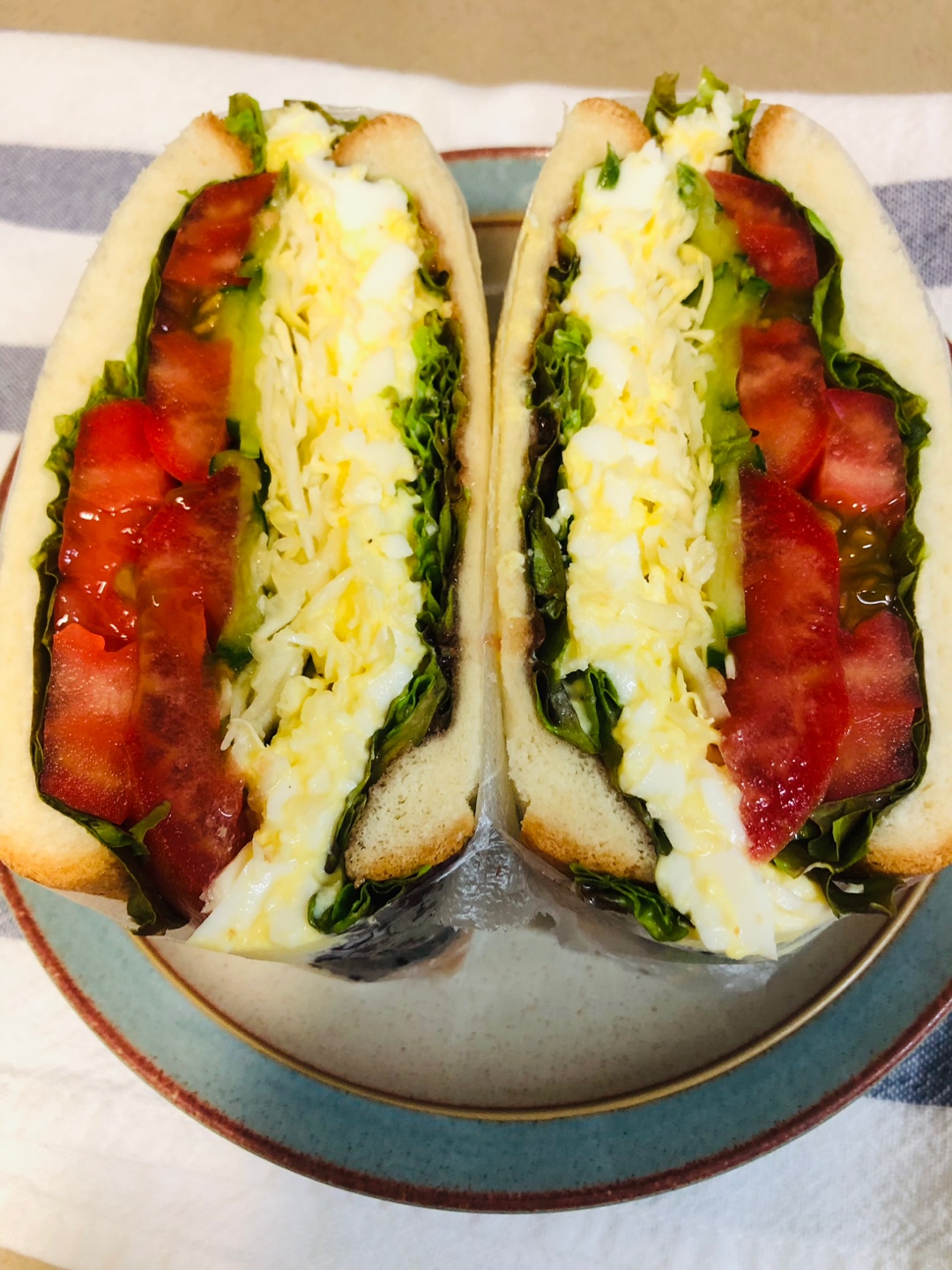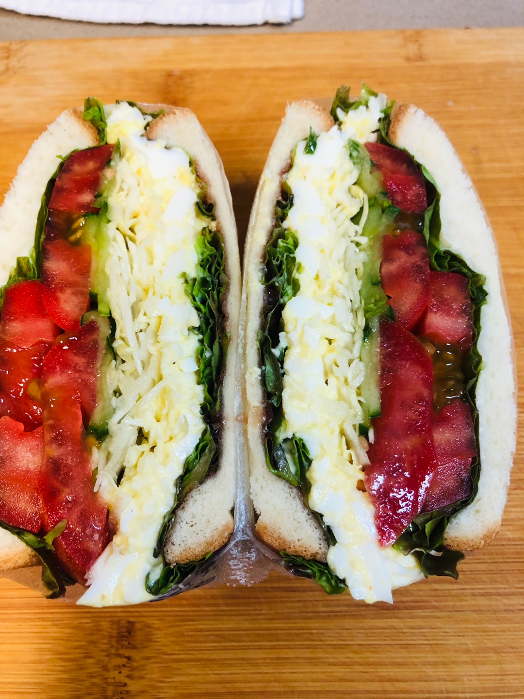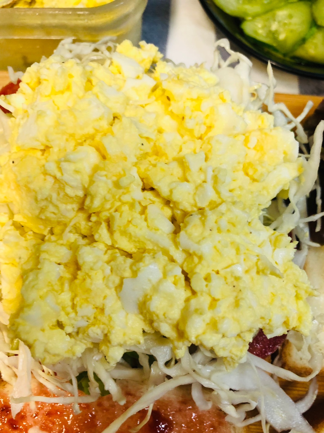 10. 마요네즈를 펴 바른 식빵 위에 상추-> 토마토->오이피클-> 채 썬 양배추(사진이 없네요 )-> 오늘의 주인공 에그마요 ->