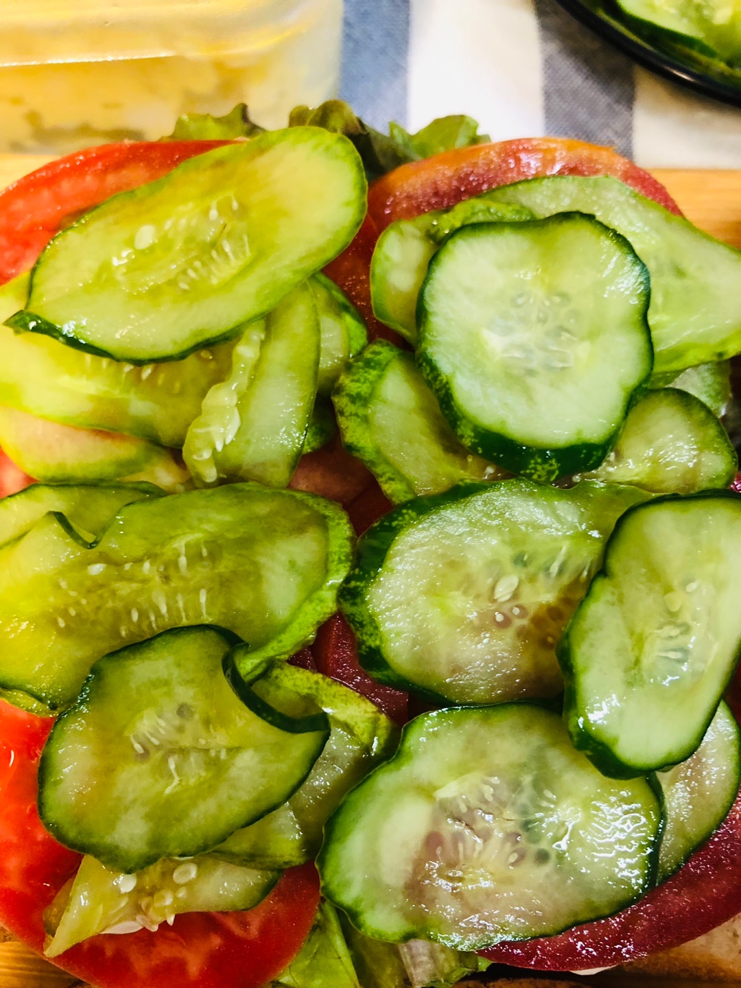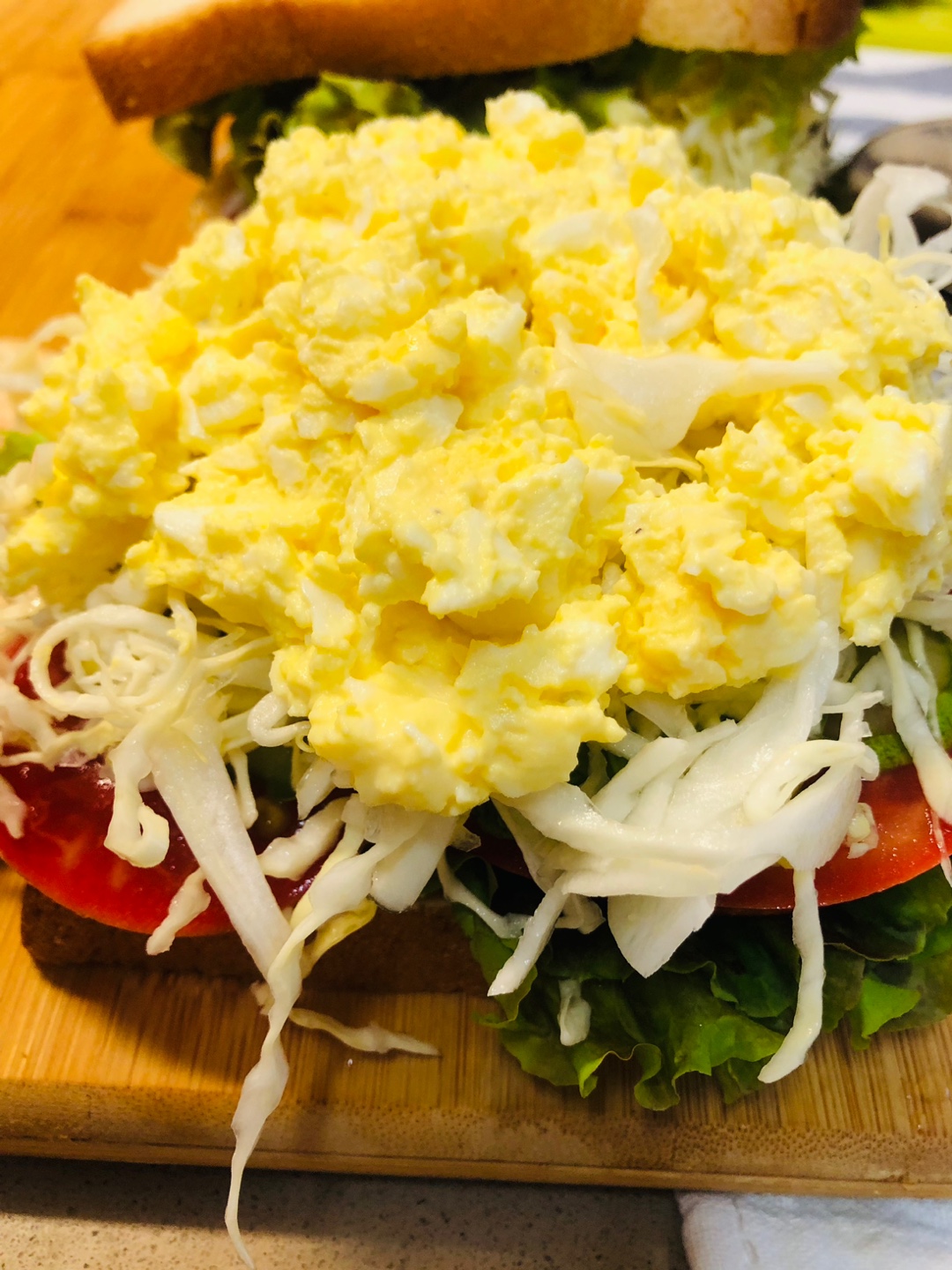 10. 마요네즈를 펴 바른 식빵 위에 상추-> 토마토->오이피클-> 채 썬 양배추(사진이 없네요 )-> 오늘의 주인공 에그마요 ->