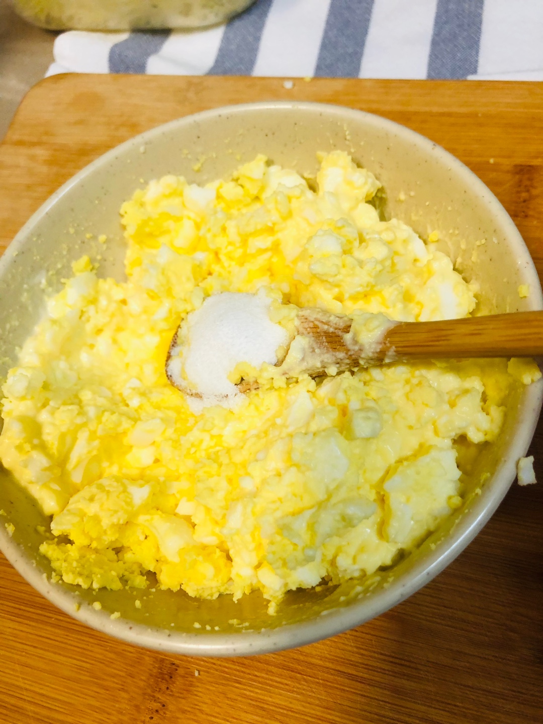 4. 으깬 달걀에 마요네즈 5T , 소금 1/2t, 설탕 2t을 넣어주고 섞어주세요~!!!