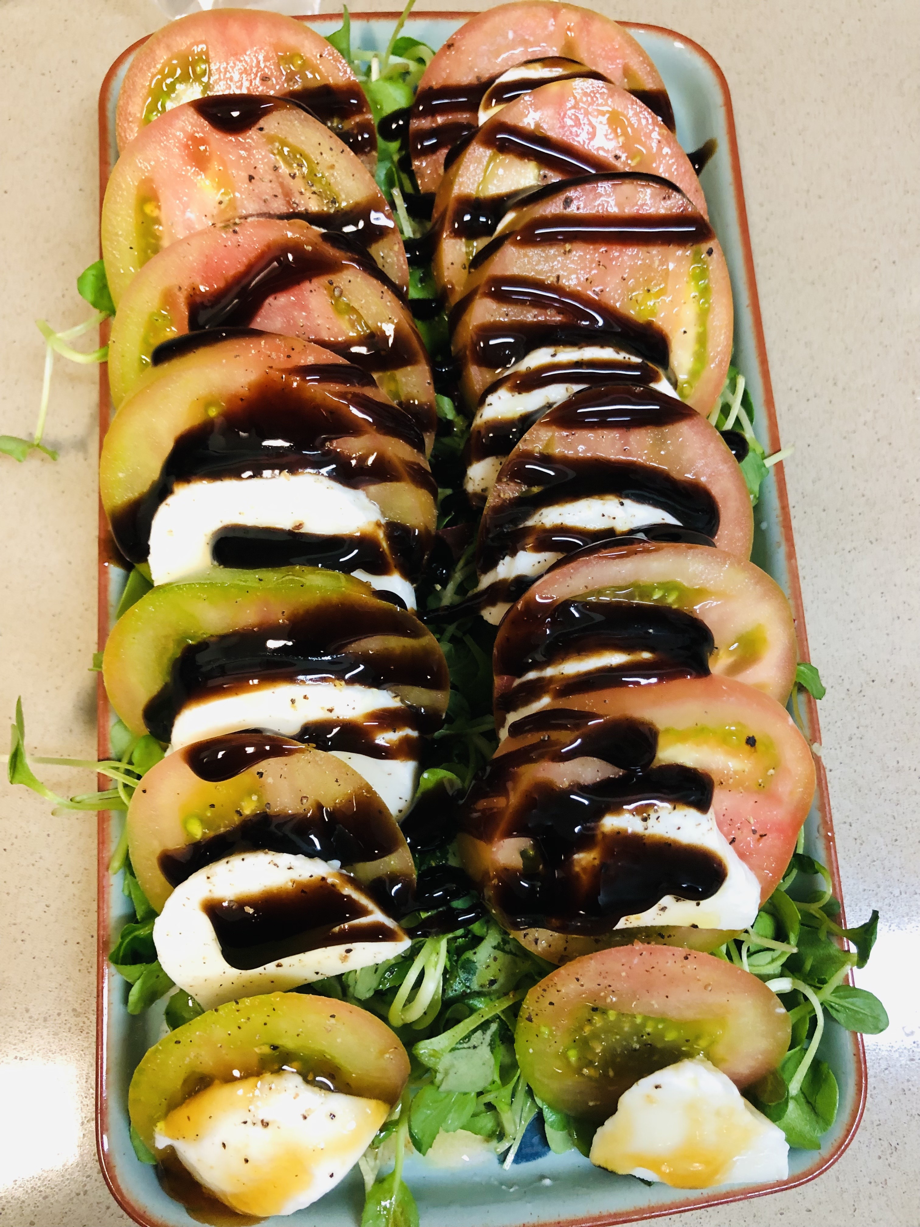 7. 발사믹 식초 글레이즈를 토마토+모차렐라 치즈 위에 뿌려줍니다. 완성~~