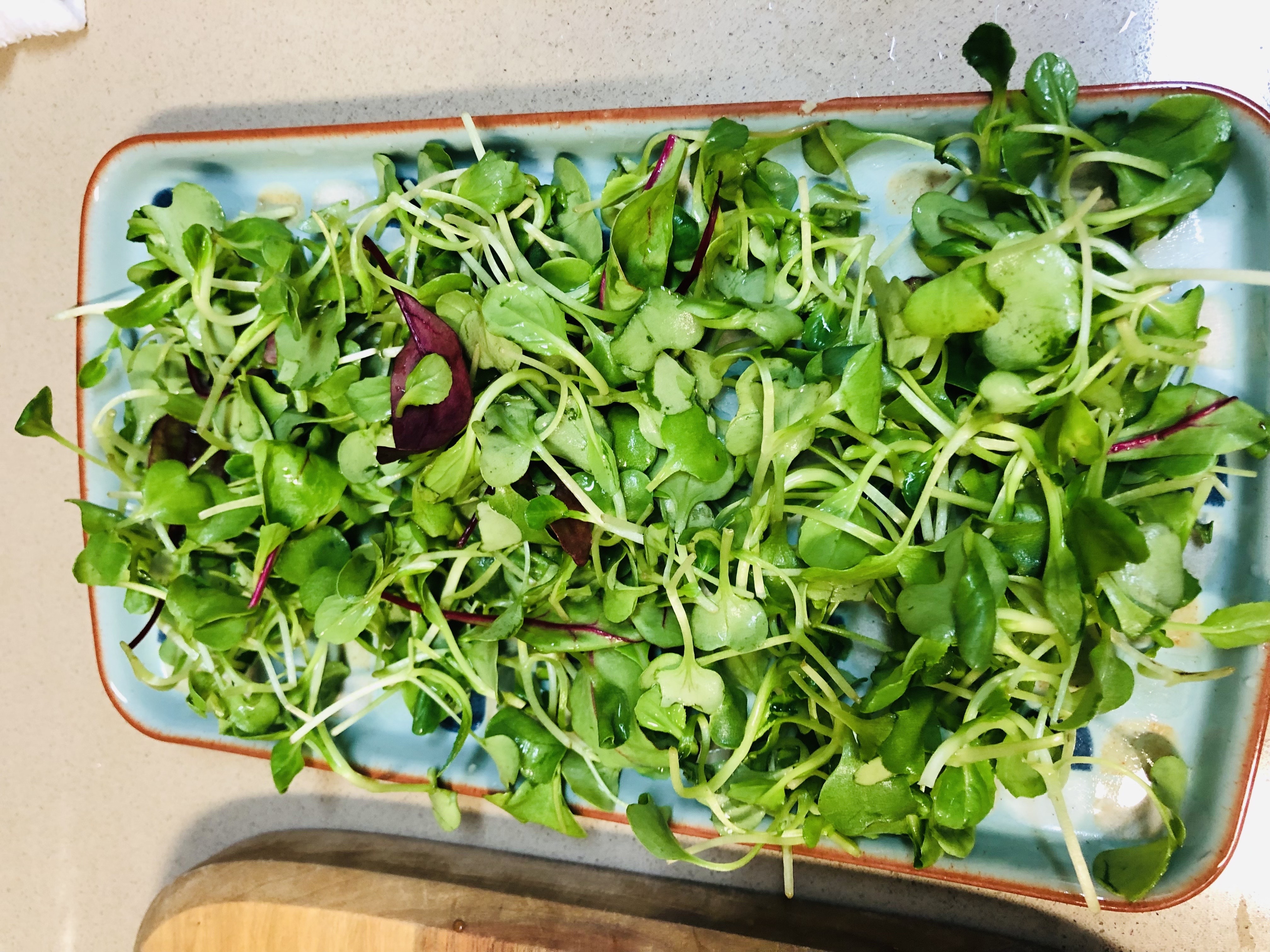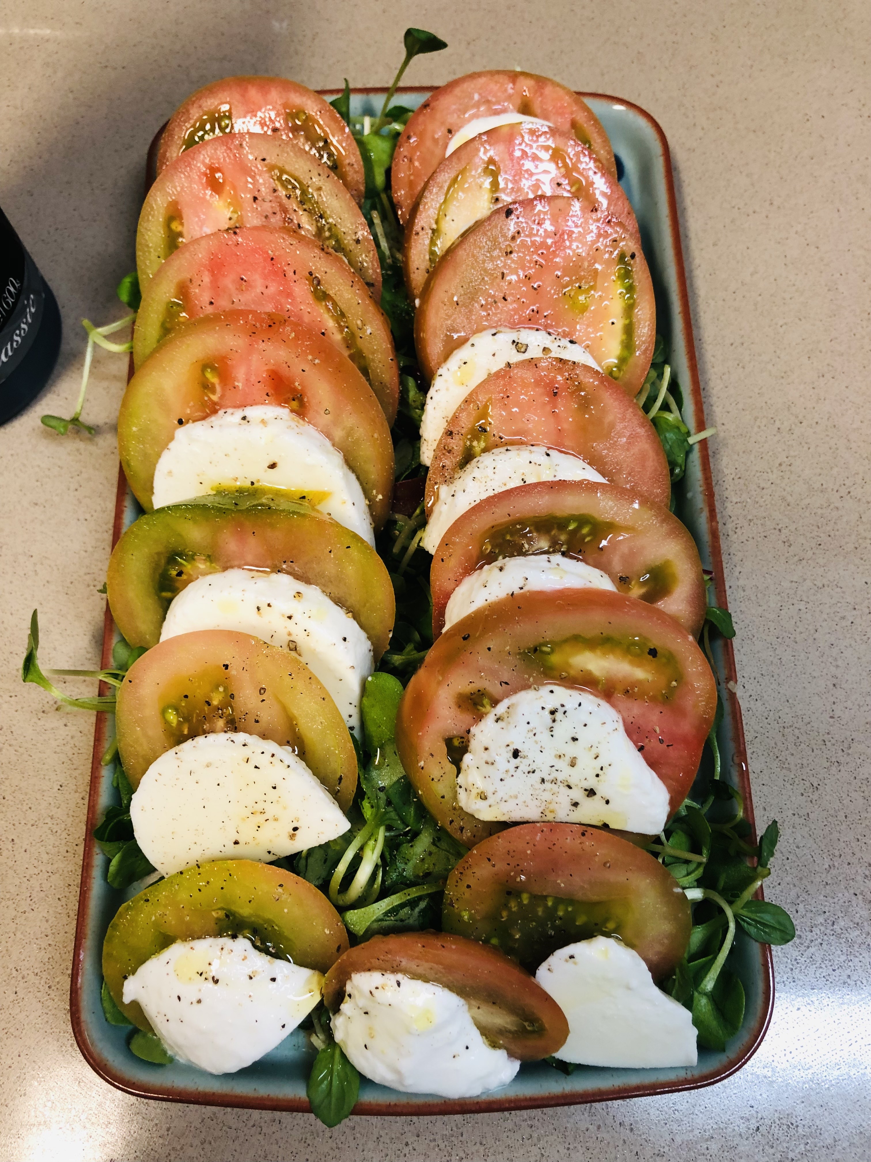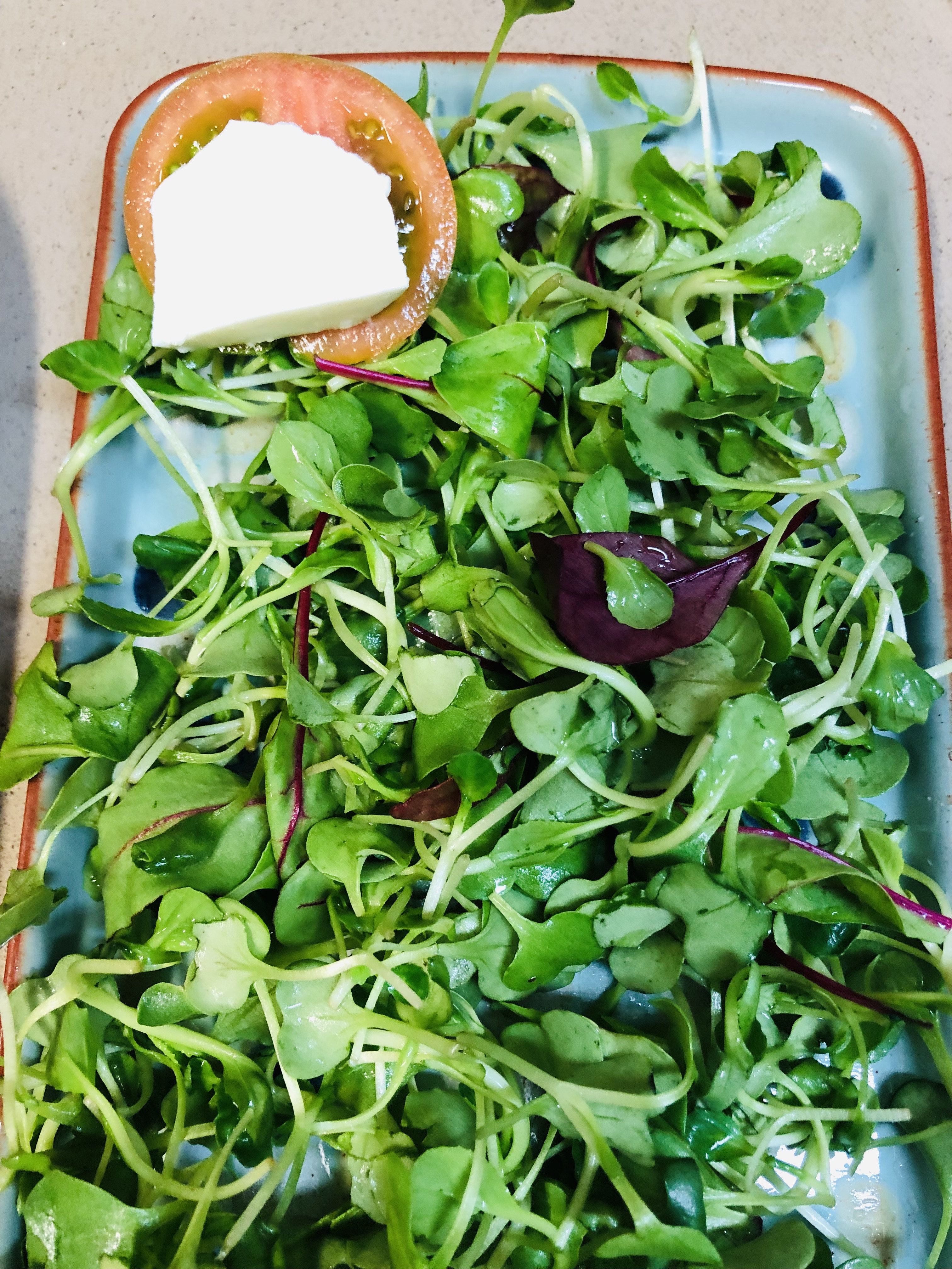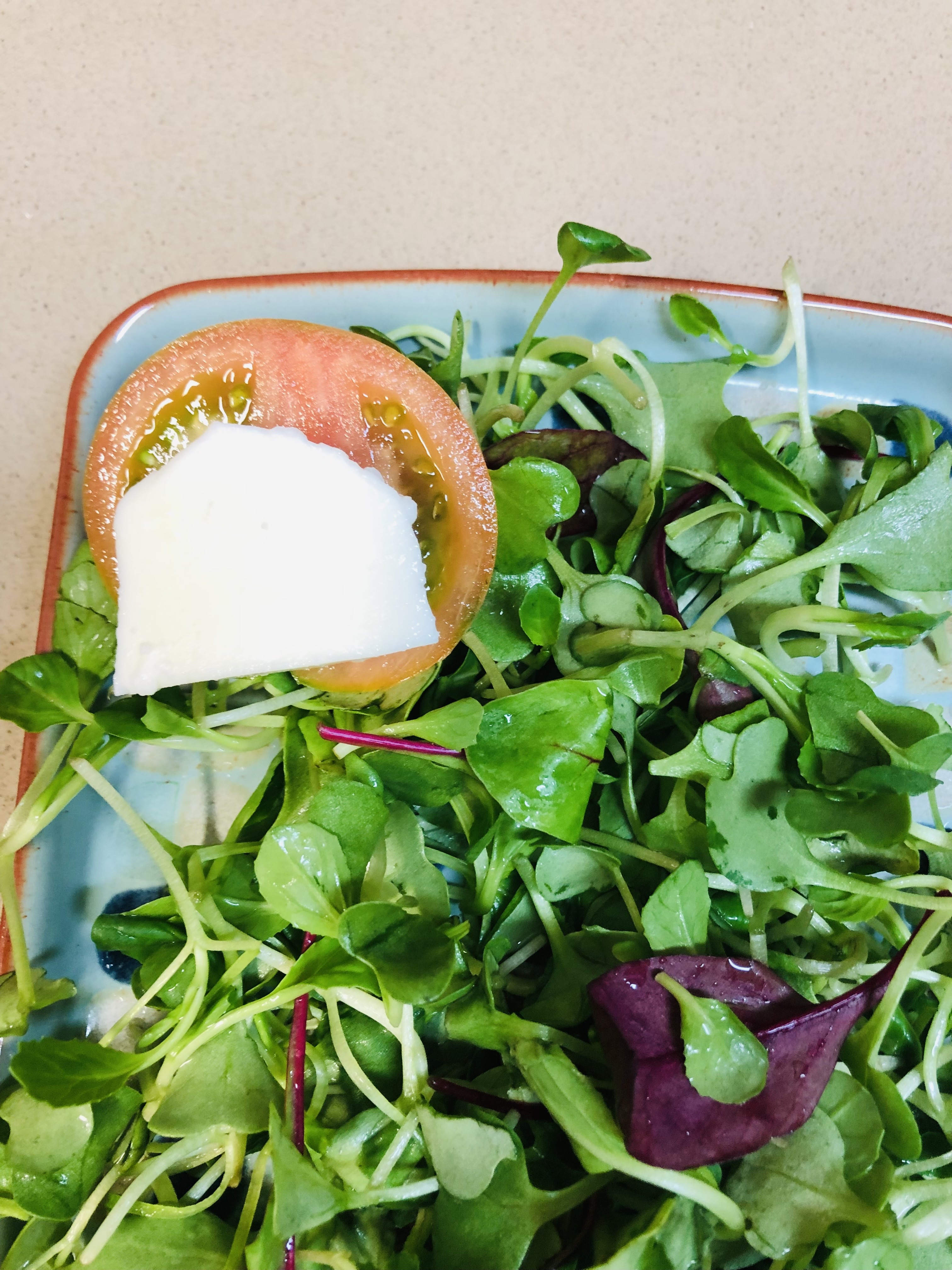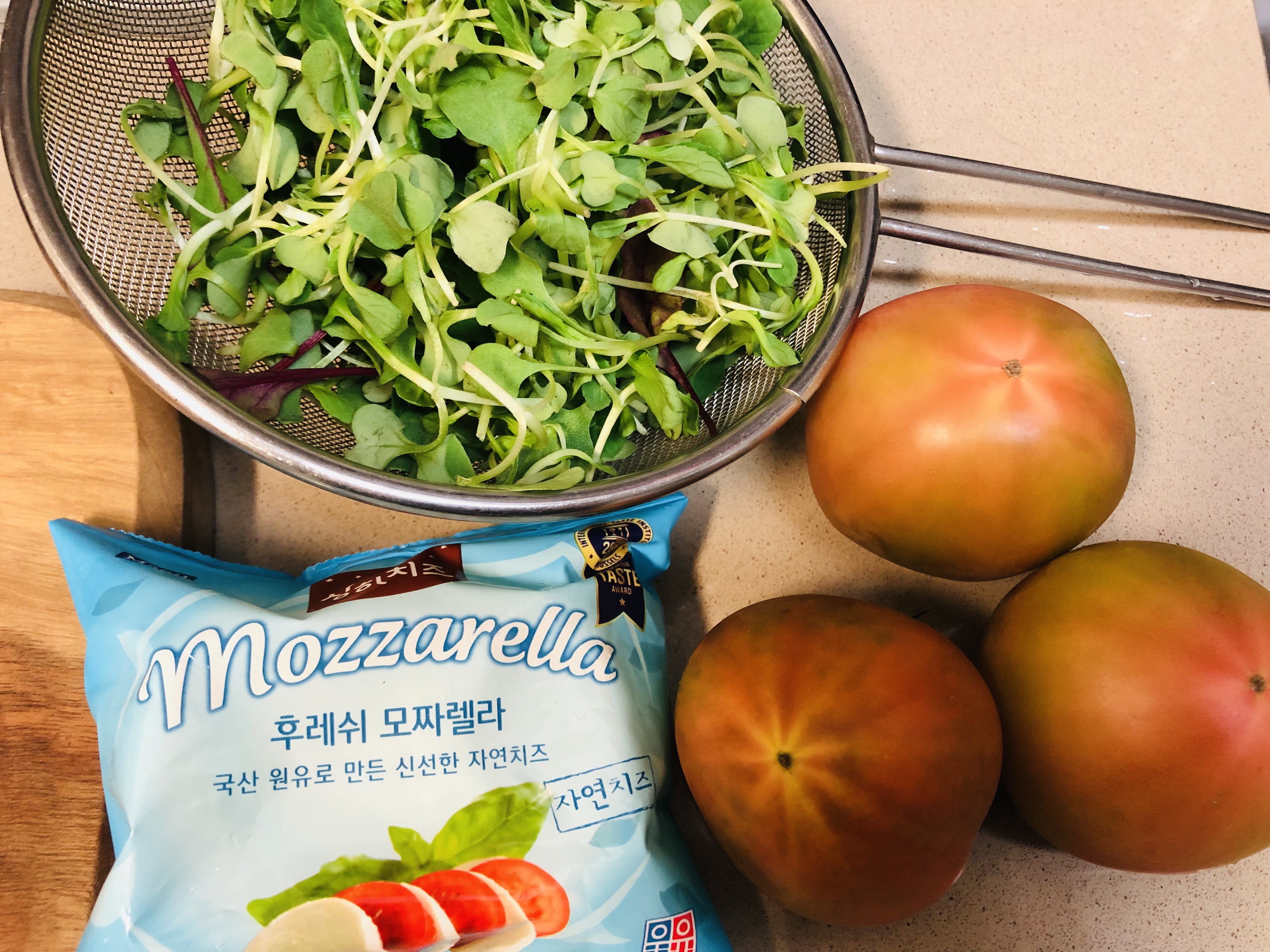 토마토 3개 , 모차렐라 치즈 1개 , 베이비 채소 두 줌정도