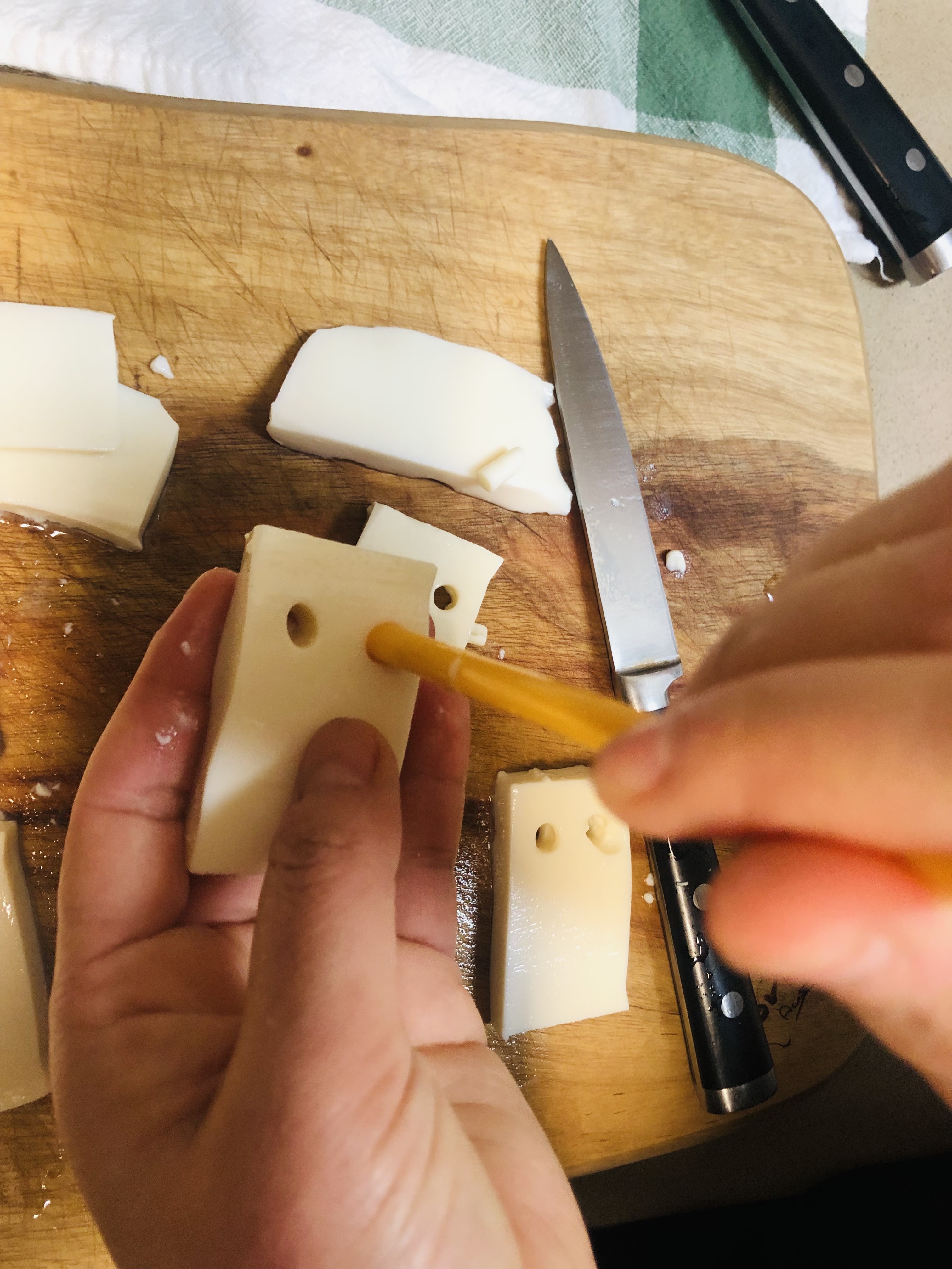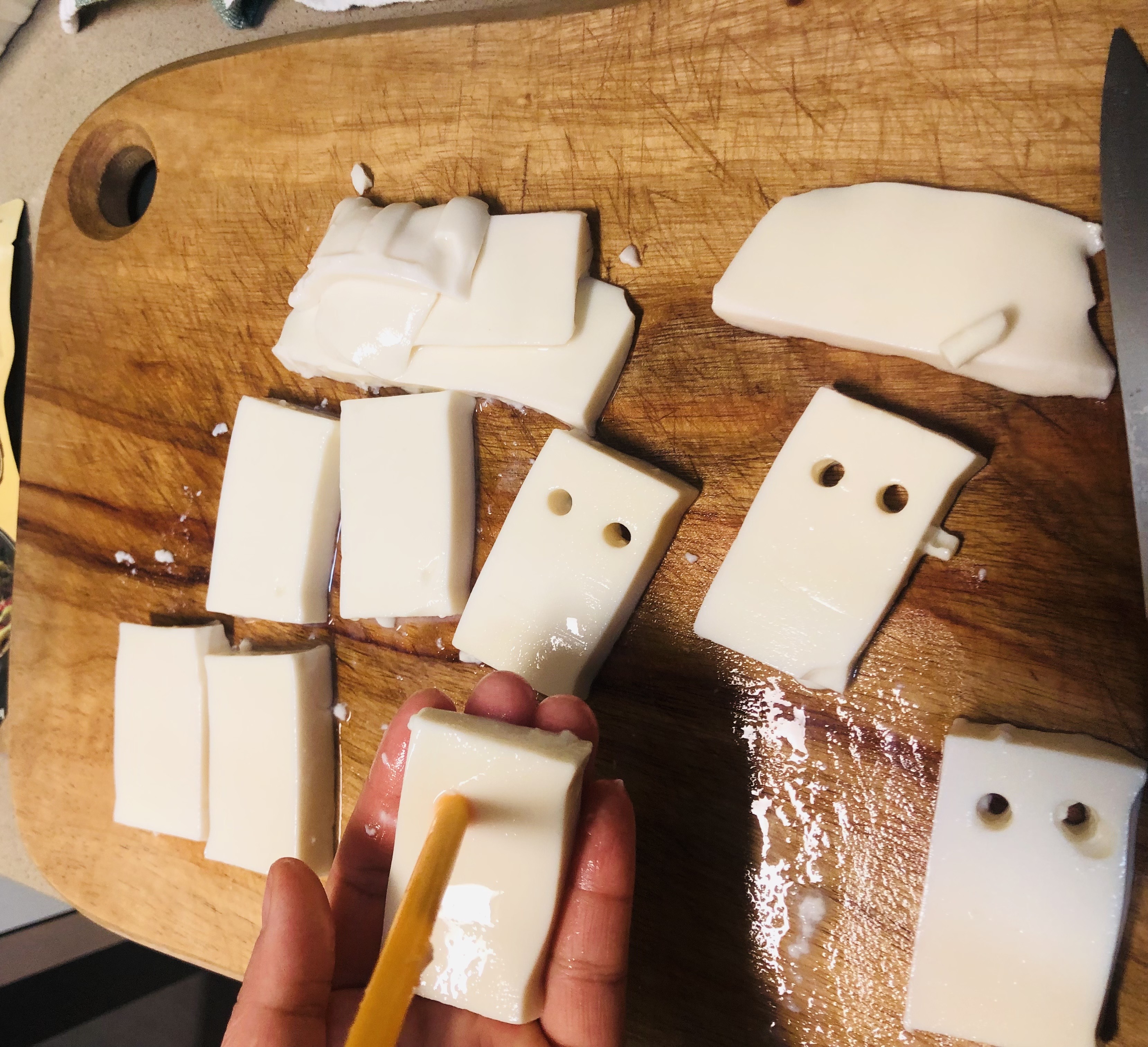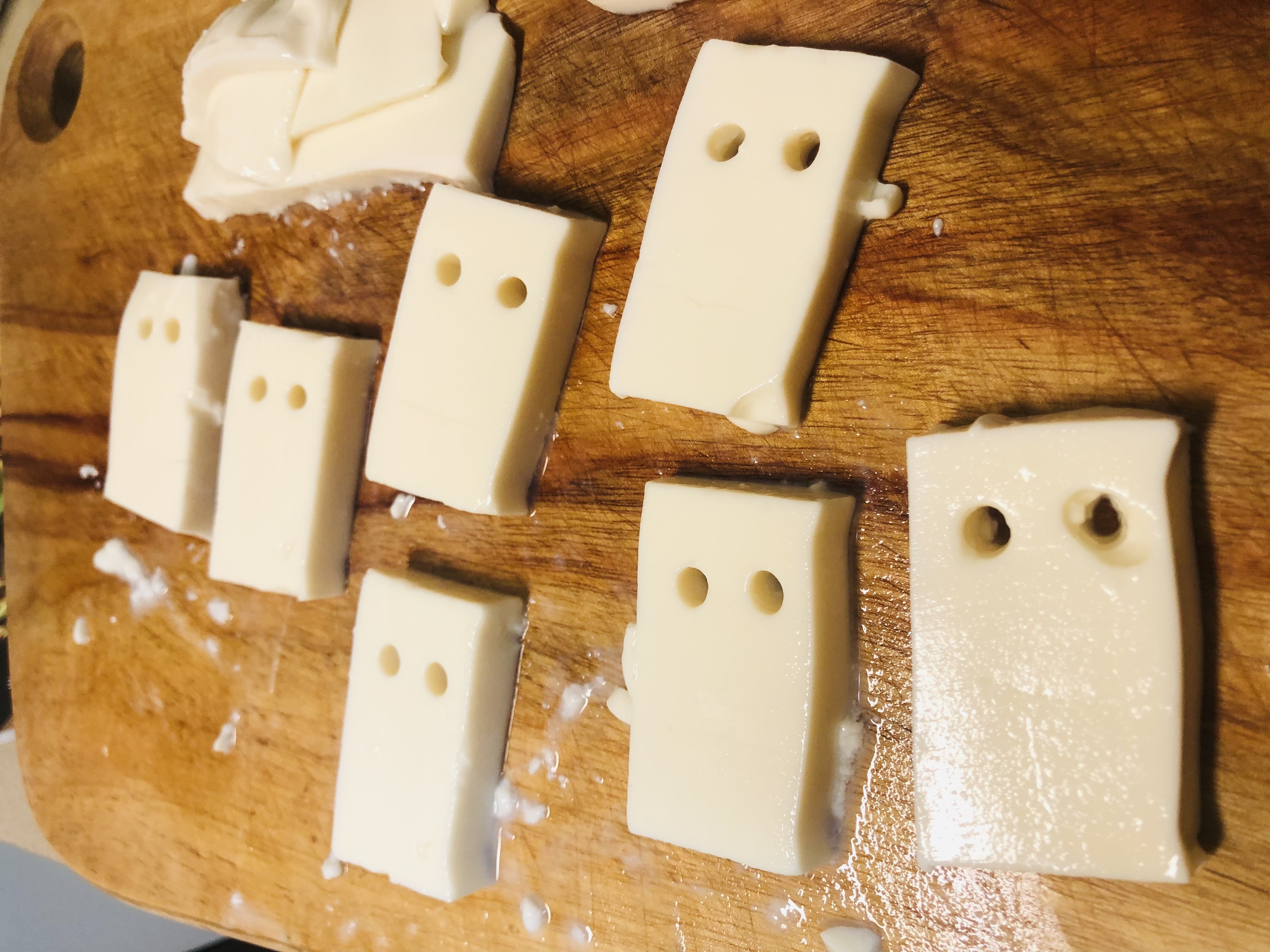 연두부를 직사각형 모양으로 자른 후 눈, 코, 입 모양을 만들어줍니다