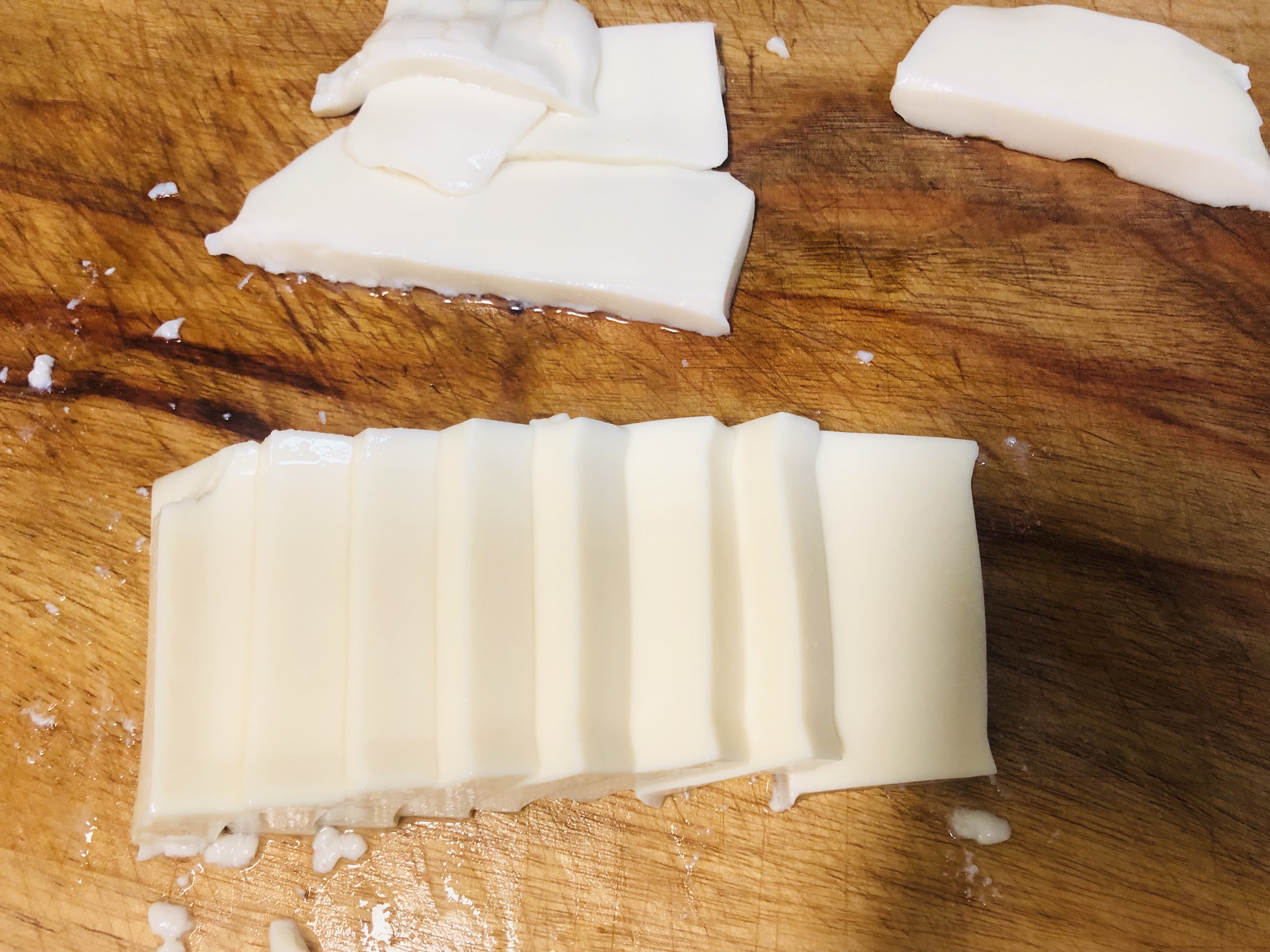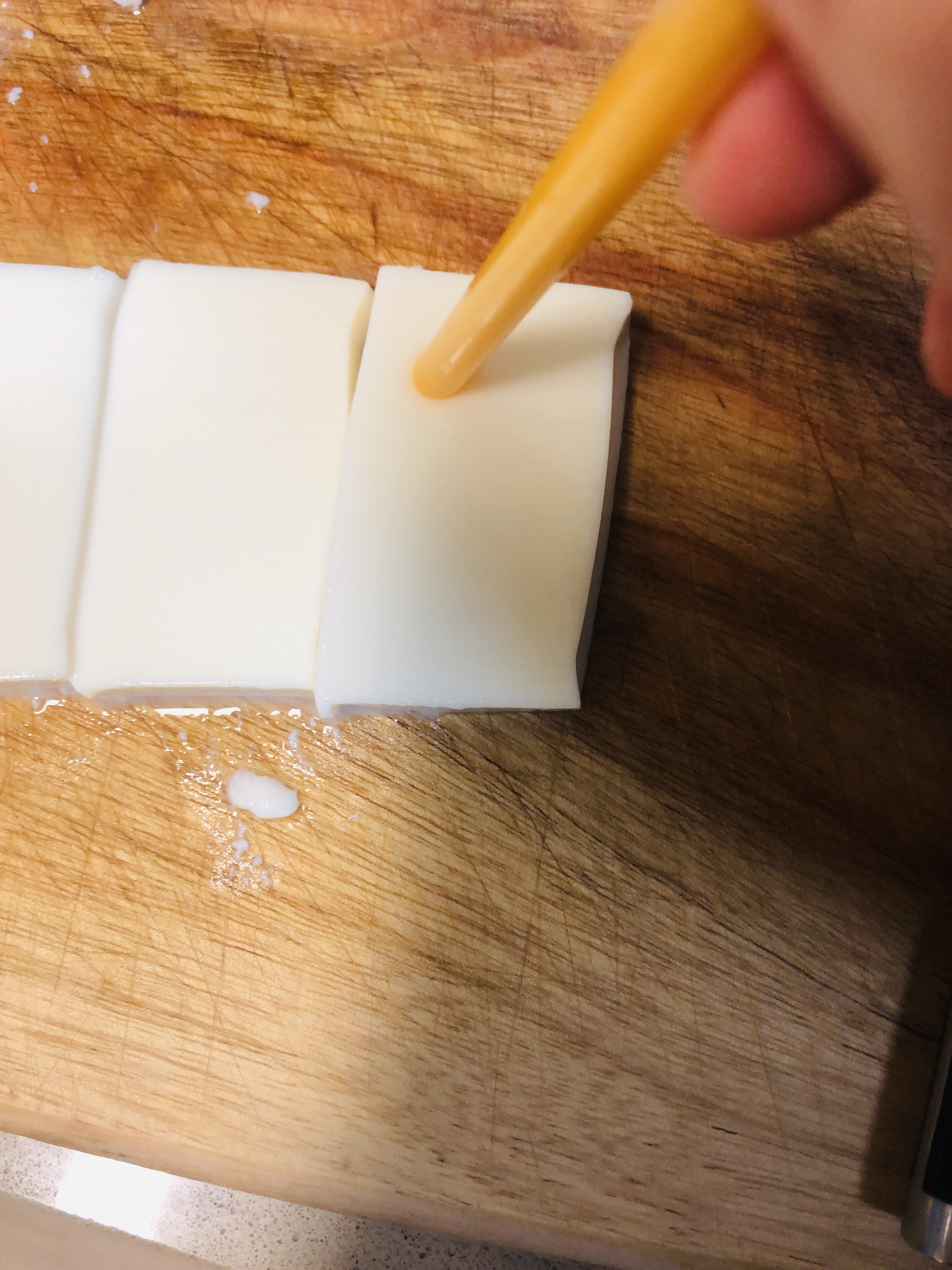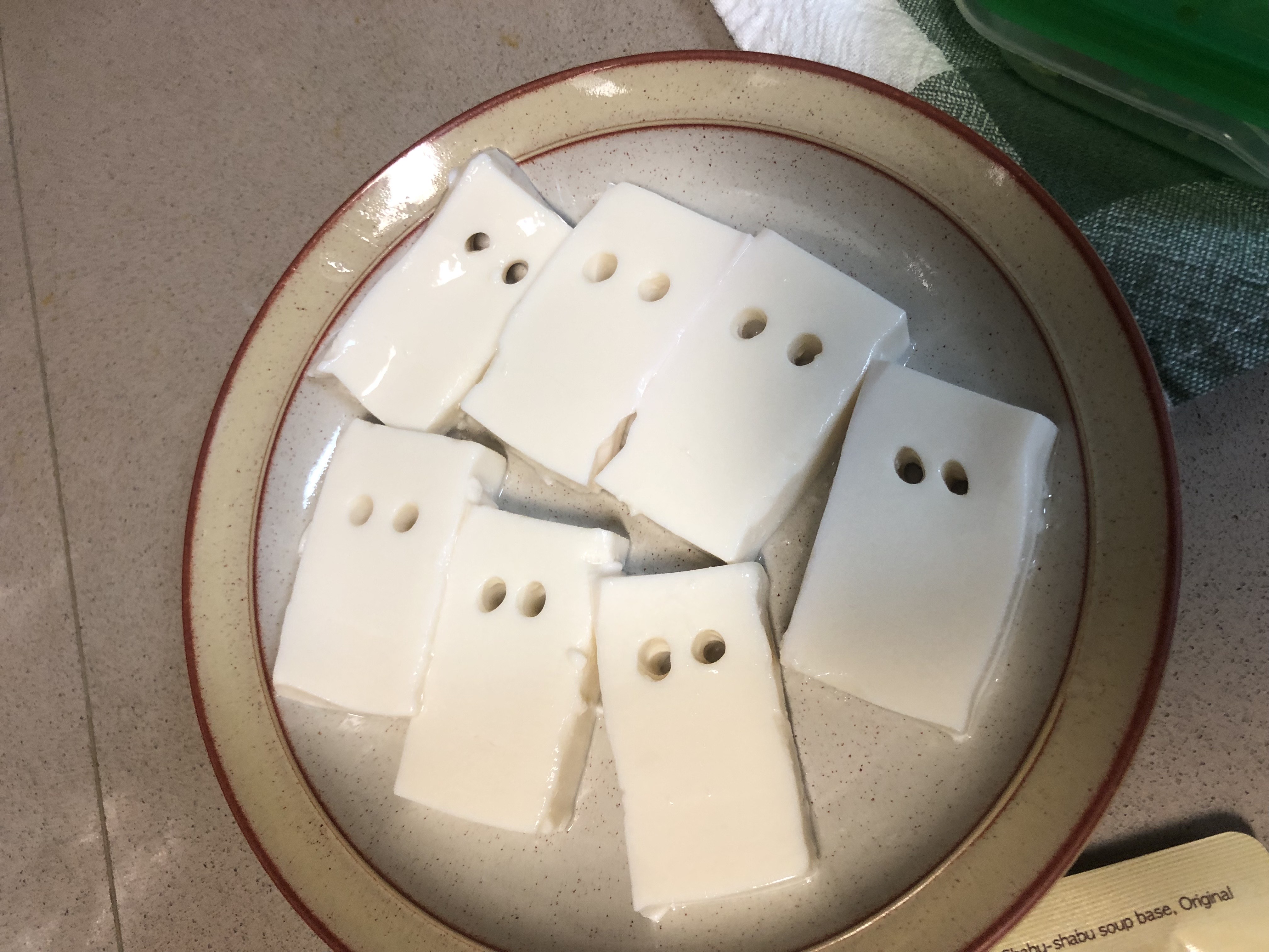 연두부를 직사각형 모양으로 자른 후 눈, 코, 입 모양을 만들어줍니다
