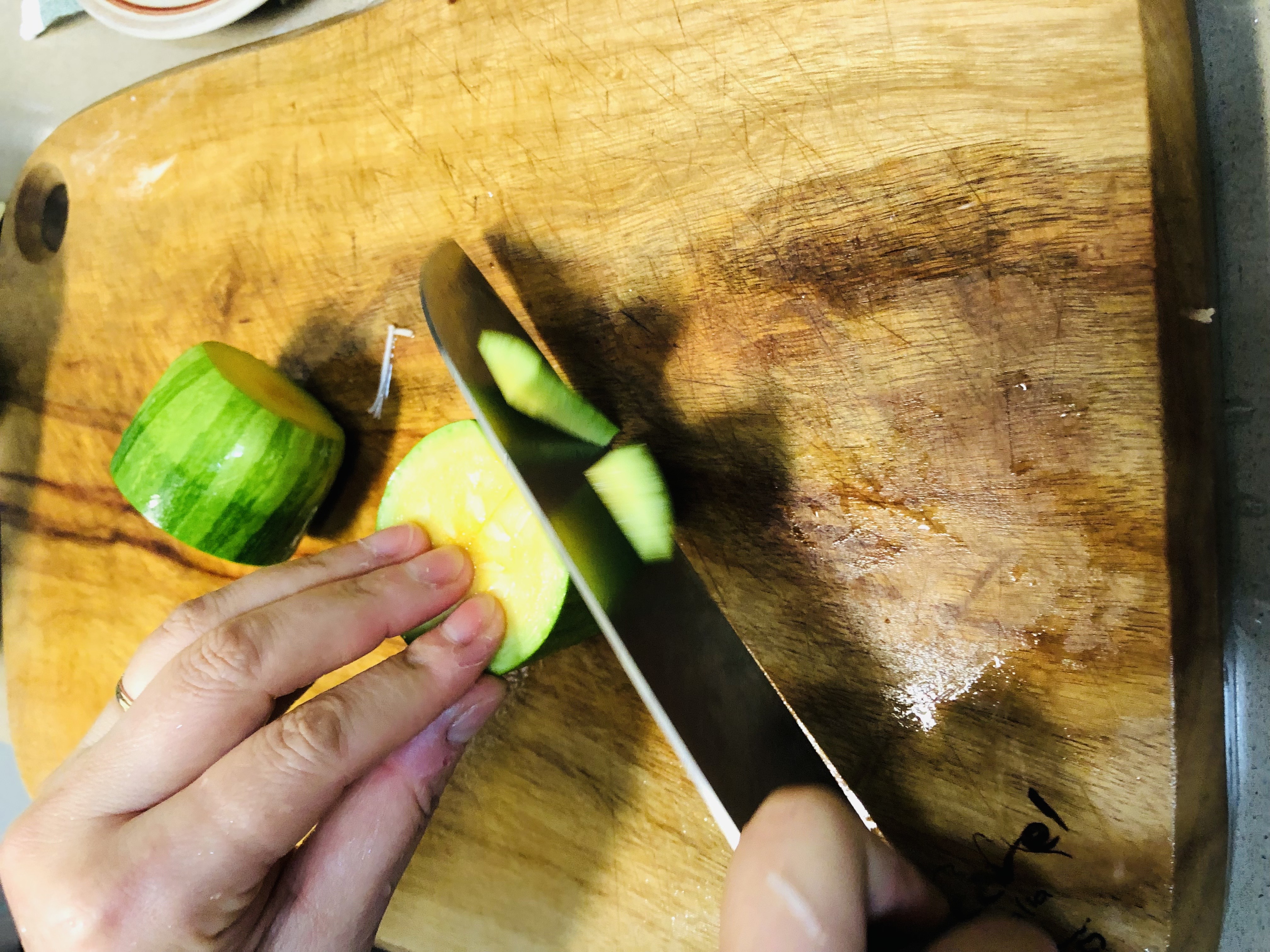 호박은 나박하게 썰어주고 대파는 어슷하게 , 알배기 배추는 큼직하게 잘라 줍니다