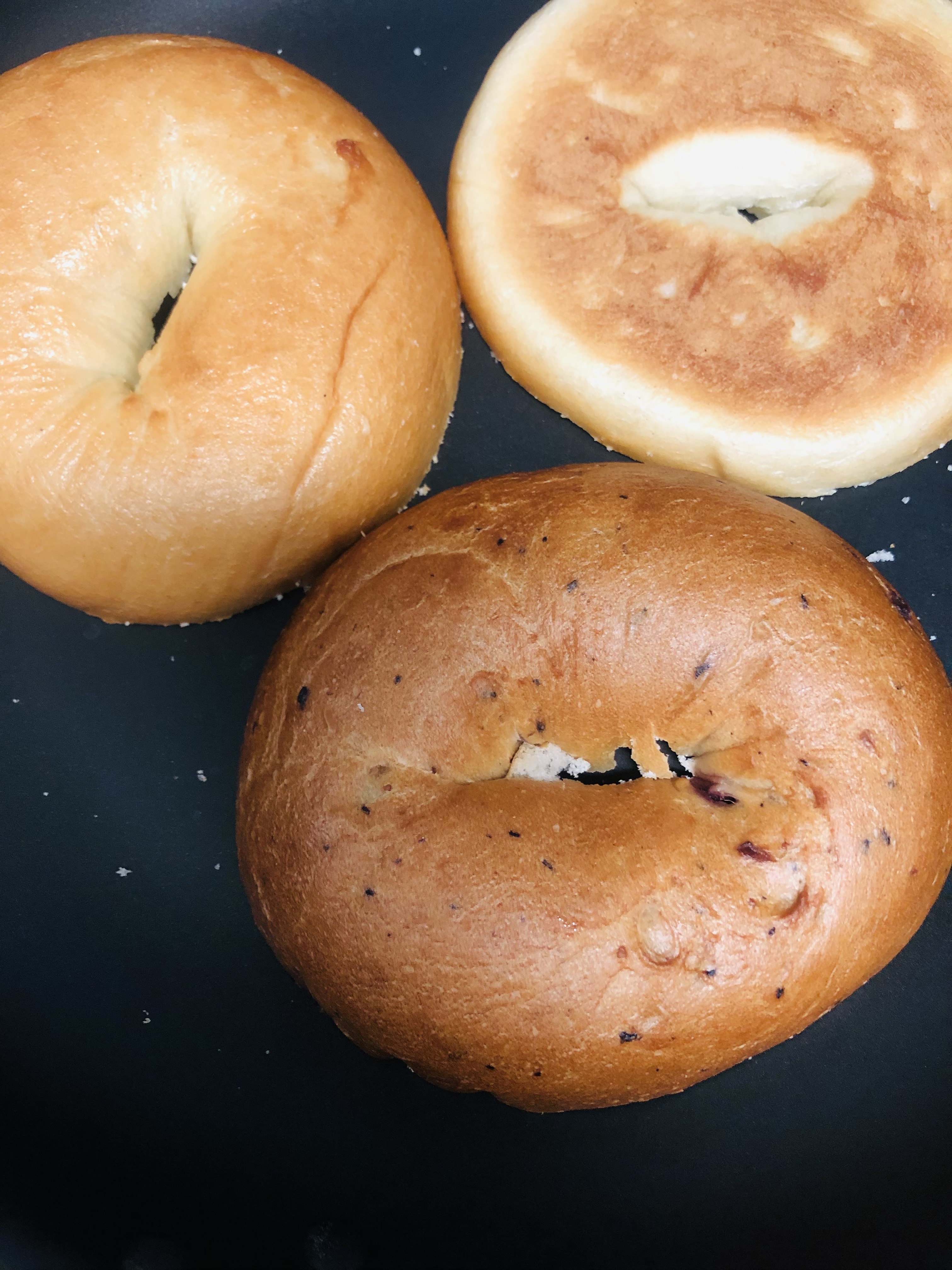 반으로 자른 베이글을 굽고